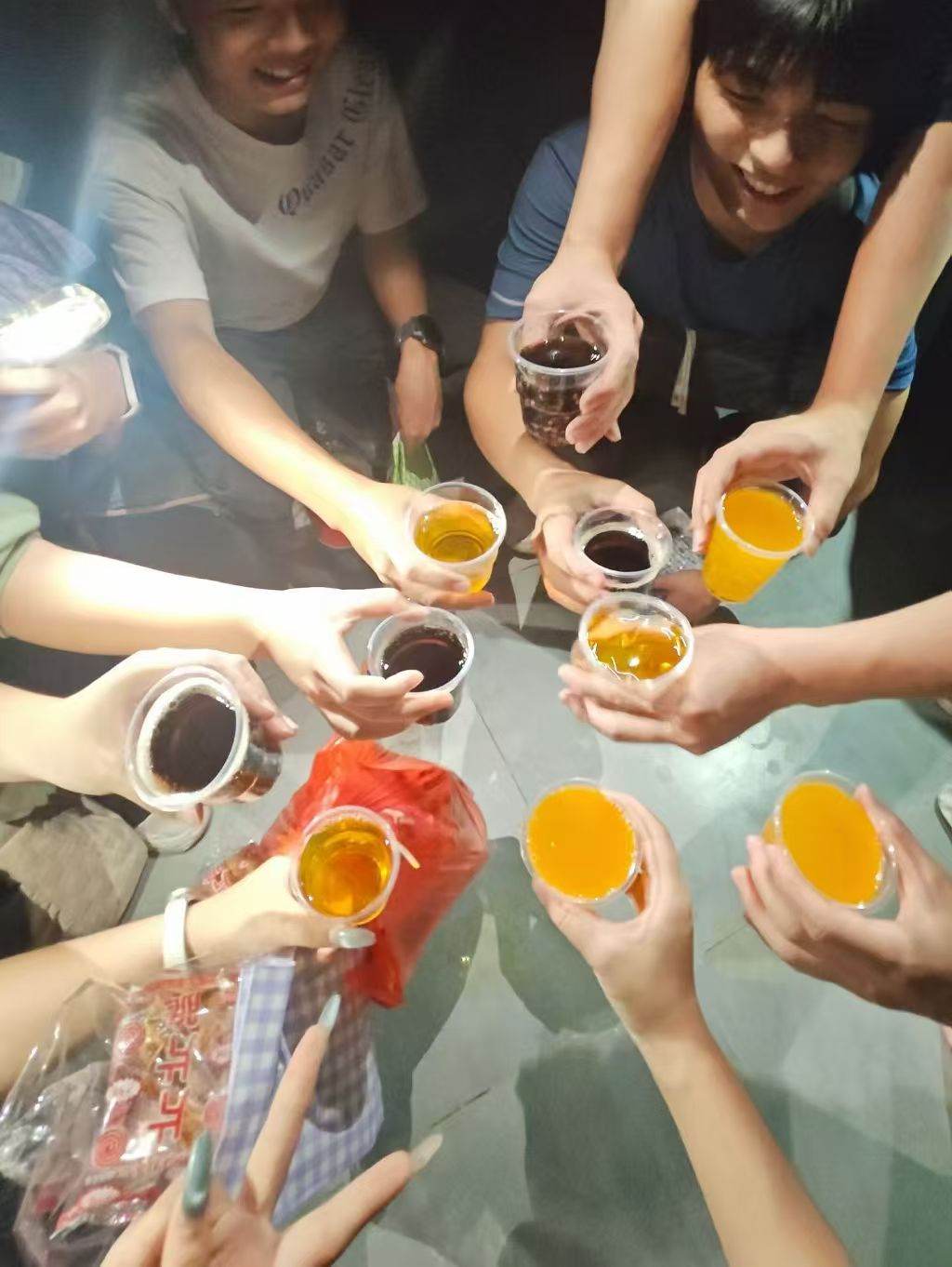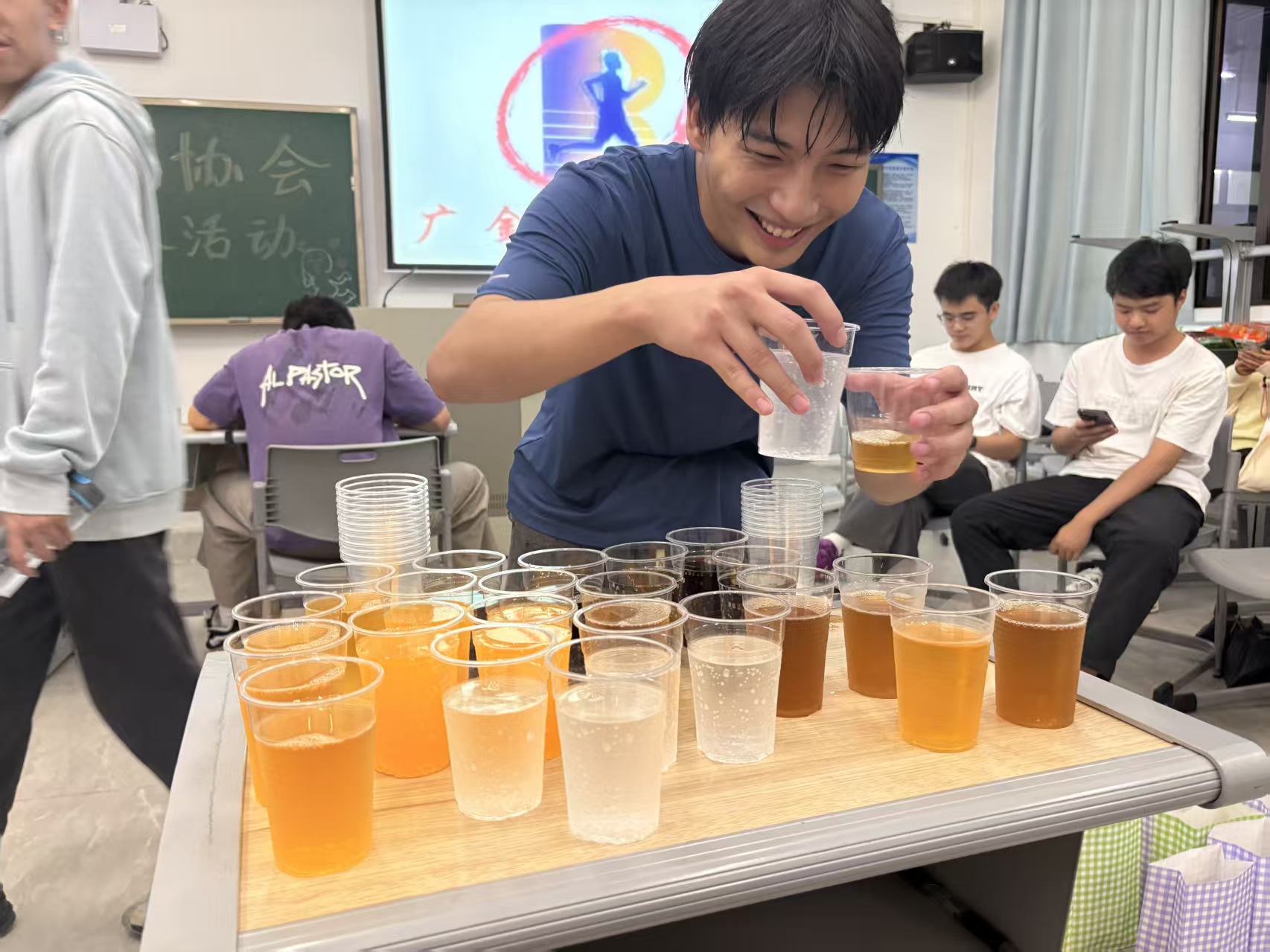 原来是六种饮料的混合特调,他笑嘻嘻地对大家解释说到。不得不说,他(今晚主要主持人)是一个很有控场能力的学长,非常有主持能力,虽然不是我心中的主持人印象,但是他能够在适当的时候做出一些举动使得大家更加活跃,永远不会冷场的感觉。(或许应该说很有幽默感)