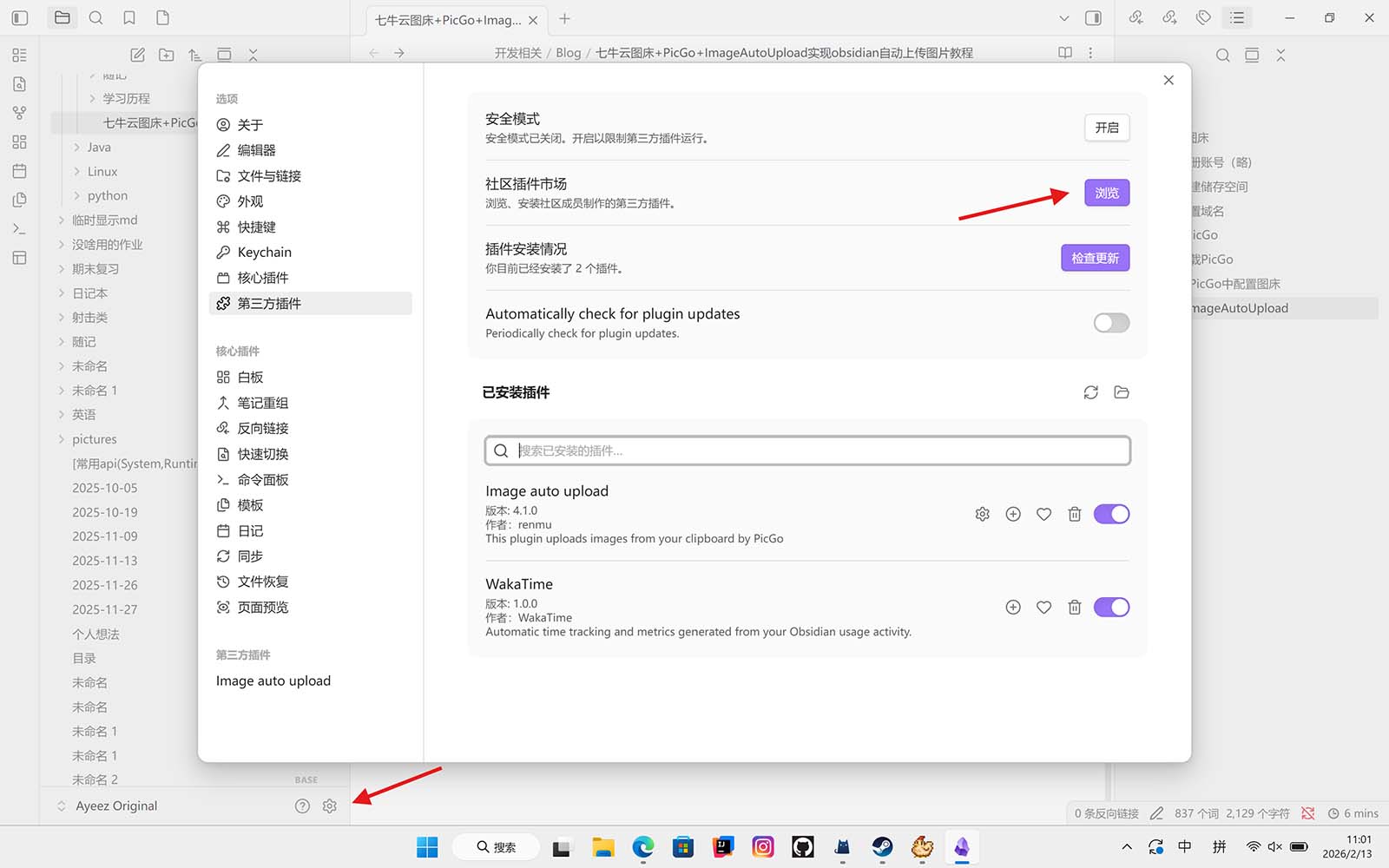 最后在设置的左下角第三方插件找到Image auto upload插件,将剪贴板自动上传开启就大功告成啦!